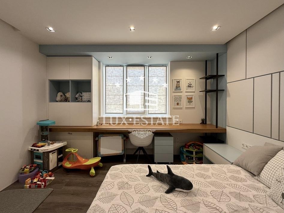 Формат квартиры: просторная кухня-гостиная с зоной отдыха у окна, хозяйская спальня со своей гардеробной и внушительных размеров с/у, детская комната, спальня со своей рабочей зоной и общий с/у.